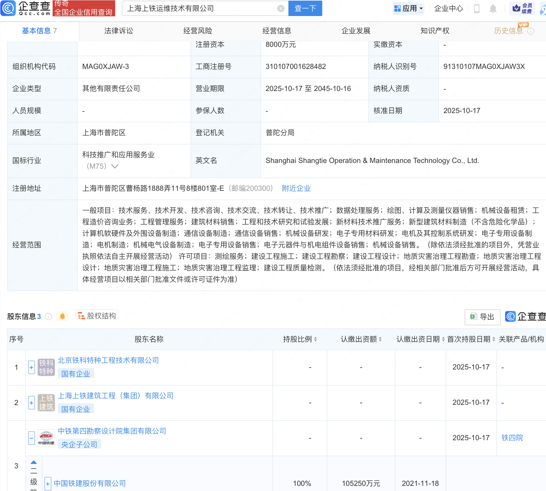 近日,上海上铁运维技术有限公司成立,注册资本8000万元,经营范围包含:电子专用材料研发;电机及其控制系统研发;电子专用设备制造等。企查查股权穿透显示,该公司由中国铁建(601186)全资子公司中铁第四勘察设计院集团有限公司等共同持股。