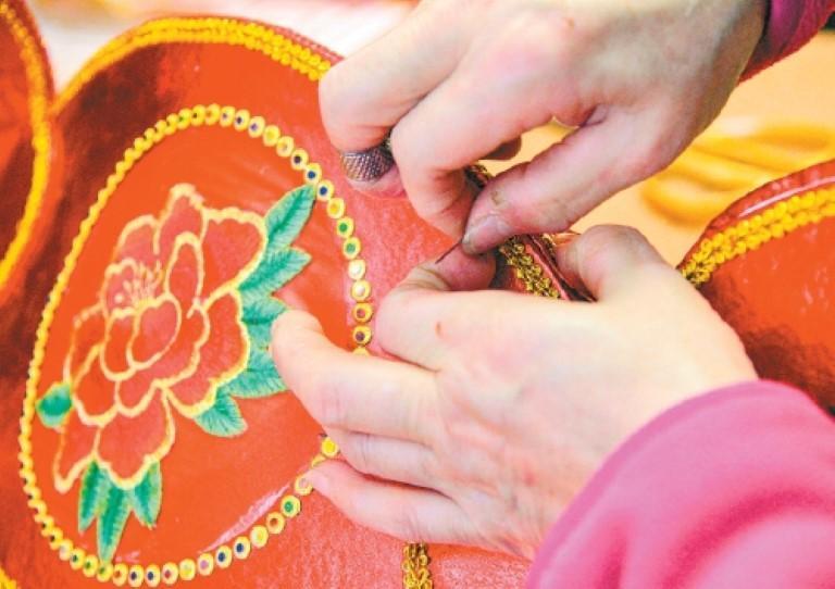 就这样经过糊褙子(将布料用糨糊粘结,晒干压平)、扎灯架、剪花样、粘面料、绣花样、制作流苏、上花样(将绣好的花样固定在灯架上)、合缝隙、装流苏、上灯具等十多道工序,宫廷绣灯才算制作完成。“做一对普通的宫廷绣灯,至少也得花20多天。”王小莲说。