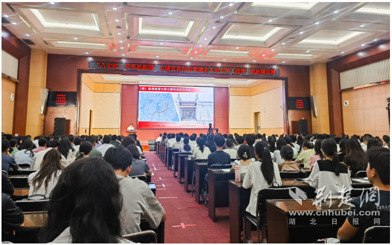 荆楚网(湖北日报网)讯(记者齐一璇)金风送爽,书声朗朗,思政课堂的火花在校园里悄然点亮。10月10日上午,“八七红·共享思政课”主题宣讲活动暨湖北工业大学《追梦》思政通识课在湖北工业大学图书馆报告厅开讲。该校师生代表,大中小学思政课一体化共同体建设单位的老师和学生代表400余人齐聚一堂,通过沉浸式、互动式的思政课堂,共同探寻大别山精神的深厚底蕴与时代价值。