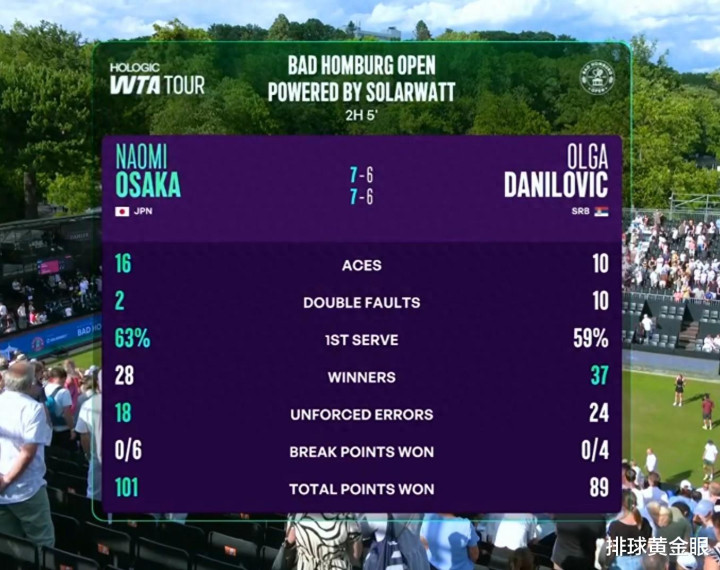 本场比赛两位球员化身“发球大炮”,突显了草地特性,最大化的放大了发球优势,两人全场共轰出26记ACE,24个发球局双方0破发。根据技术统计,大坂直美16记Ace,2次双误,达尼洛维奇10记Ace,10次失误。虽然大坂直美制胜分只有28次,落后对手的37次,但非受迫性失误比对手少送6分。