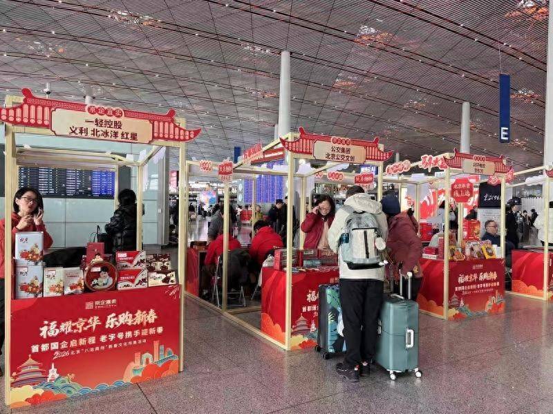 在首都机场T3航站楼内举办的文化市集也为中外旅客铺就一条充满京味年俗的旅途风景。市集现场,不少旅客一抵达首都机场便被红火的新年景象所吸引:“北京的年味儿真浓,一下飞机就感受到了!” 14家北京老字号及非遗项目通过线下展示与线上销售相结合的方式,不仅营造出浓厚的节日氛围,更成为北京面向世界展示传统文化的重要窗口。