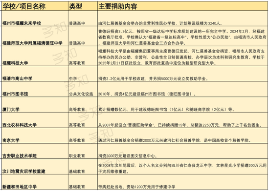 曹德旺在教育领域的捐助涵盖了从基础教育到高等教育的多个层次,具有金额巨大、持续投入、聚焦国家战略需求的特点。其中,有的是联合政府等发起创办一所新学校,这涉及到的不仅是资金,还有管理等更深层次的链条,有的教育项目仅是捐助。
