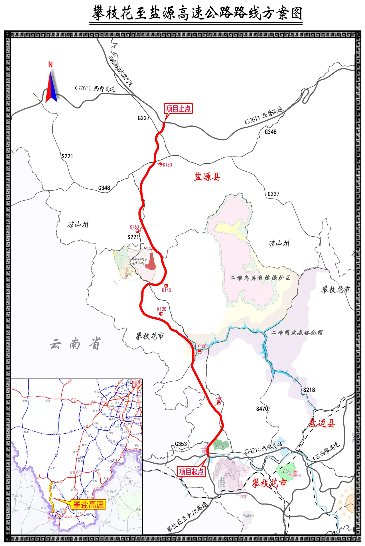 攀盐高速公路项目属国家“十四五”规划重大项目,项目全长约131.3公里,其中攀枝花境内约86.3公里,凉山州境内约45公里,全线双向四车道,设计时速80公里,共设桥梁67座、隧道20座、互通式立交10处,桥隧比高达80%。项目于2025年9月启动施工,预计建设工期6年。